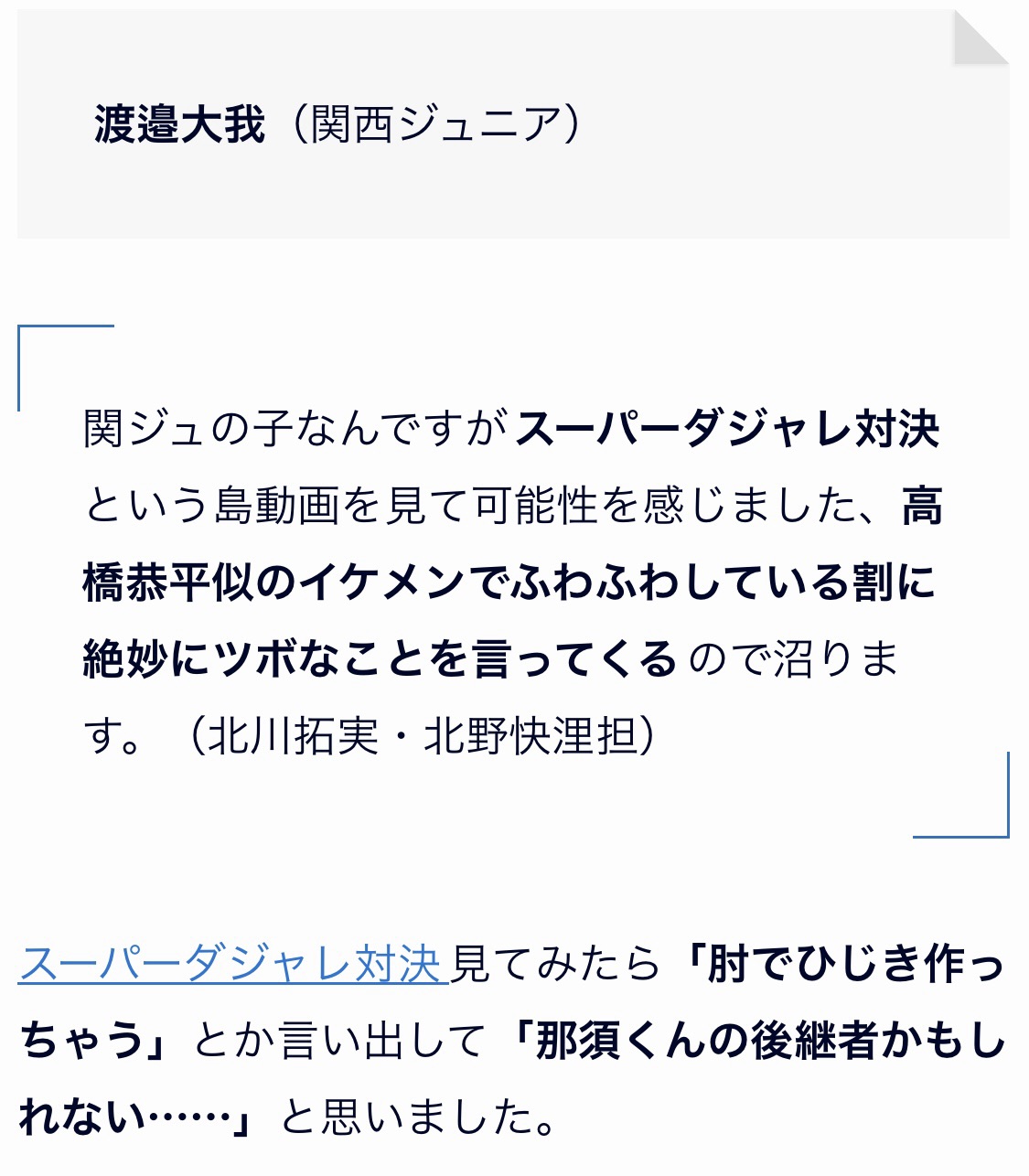 この時の島動画はもう見ることができないのですが(泣)正直この時は今よりおぼこい少年だったので「高橋恭平に似てるのか?」と疑っていたんですが、久々にちゃんと顔みたらかなり高橋恭平方向の綺麗な男の子に育ってました。北川&北野担の回答者さん、その節はすみませんでした。